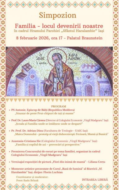 Parohia „Sfântul Haralambie” din Iași marchează hramul prilejuit de sărbătorirea Sfântului Haralambie, ocrotitorul comunității parohiale, printr-o serie de evenimente dedicate familiei și valorilor creștine. Cu acest prilej, va avea loc Simpozionul „Familia – locul devenirii noastre”, începând cu ora 17.00, la Palatul Braunstein. Evenimentul va cuprinde următoarele conferințe: